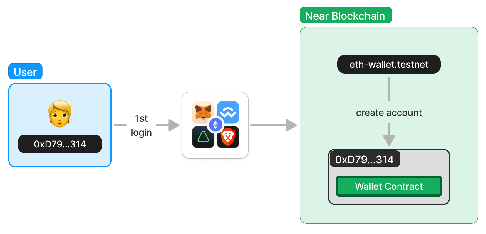 On your first login, a NEAR accounts with the same address as your Ethereum wallet is created, and the Wallet Contract is deployed on it
